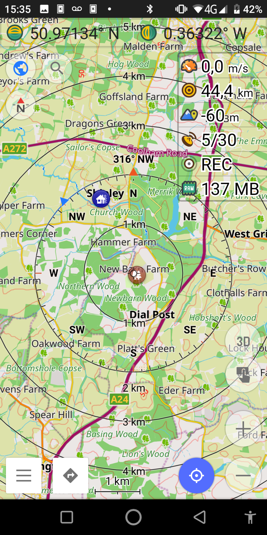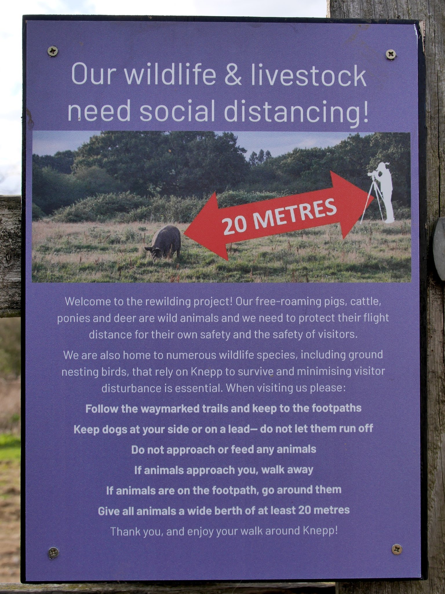 Knepp is approximately 12 km south of Horsham and 10 km south east of Billingshurst near the junction of the A24 and the A272. The main entrance is just off the A24, London-Worthing road. The address for the main visitors area is Worthing Road, Dial Post, RH13 8NQ. Ordnance Survey grid reference. TO 15011 20377. The car park is open from 07:00 to 19:00. There is no overnight parking and there is a 20 km/h | 13 mph speed limit on the access road.